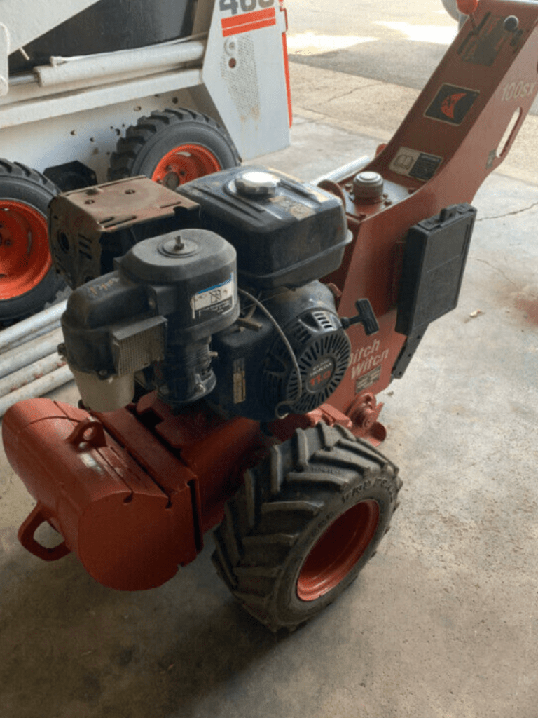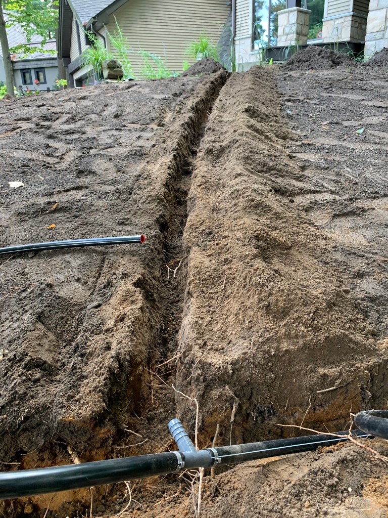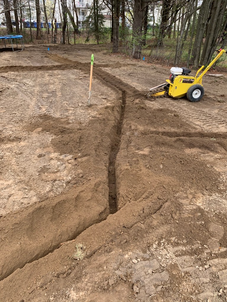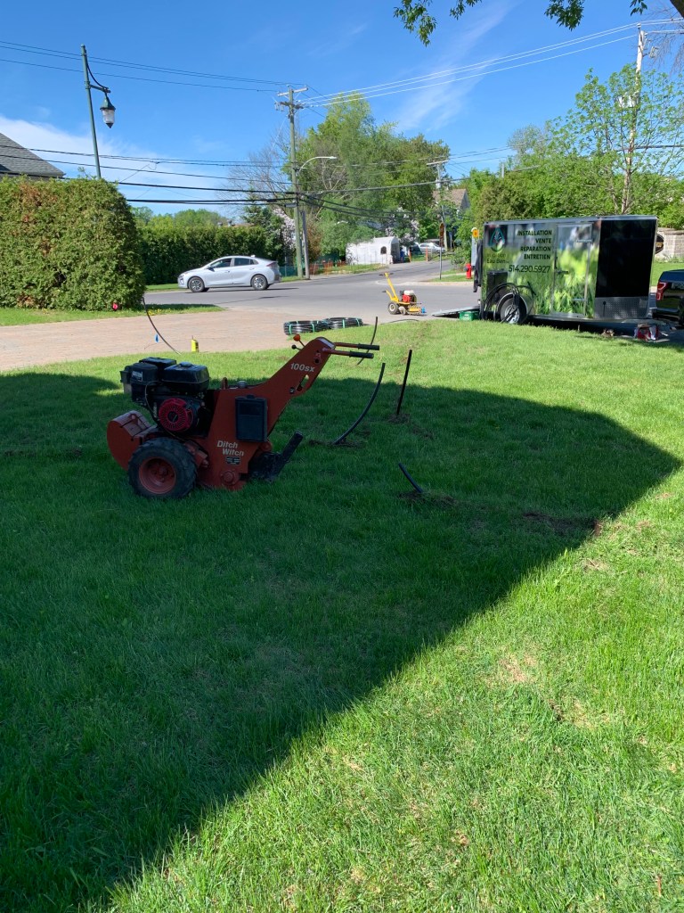 Sur un terrain sans gazon, des tranchés seront effectuées afin d’installer les tuyaux à l’aide d’une trancheuse mécanique.